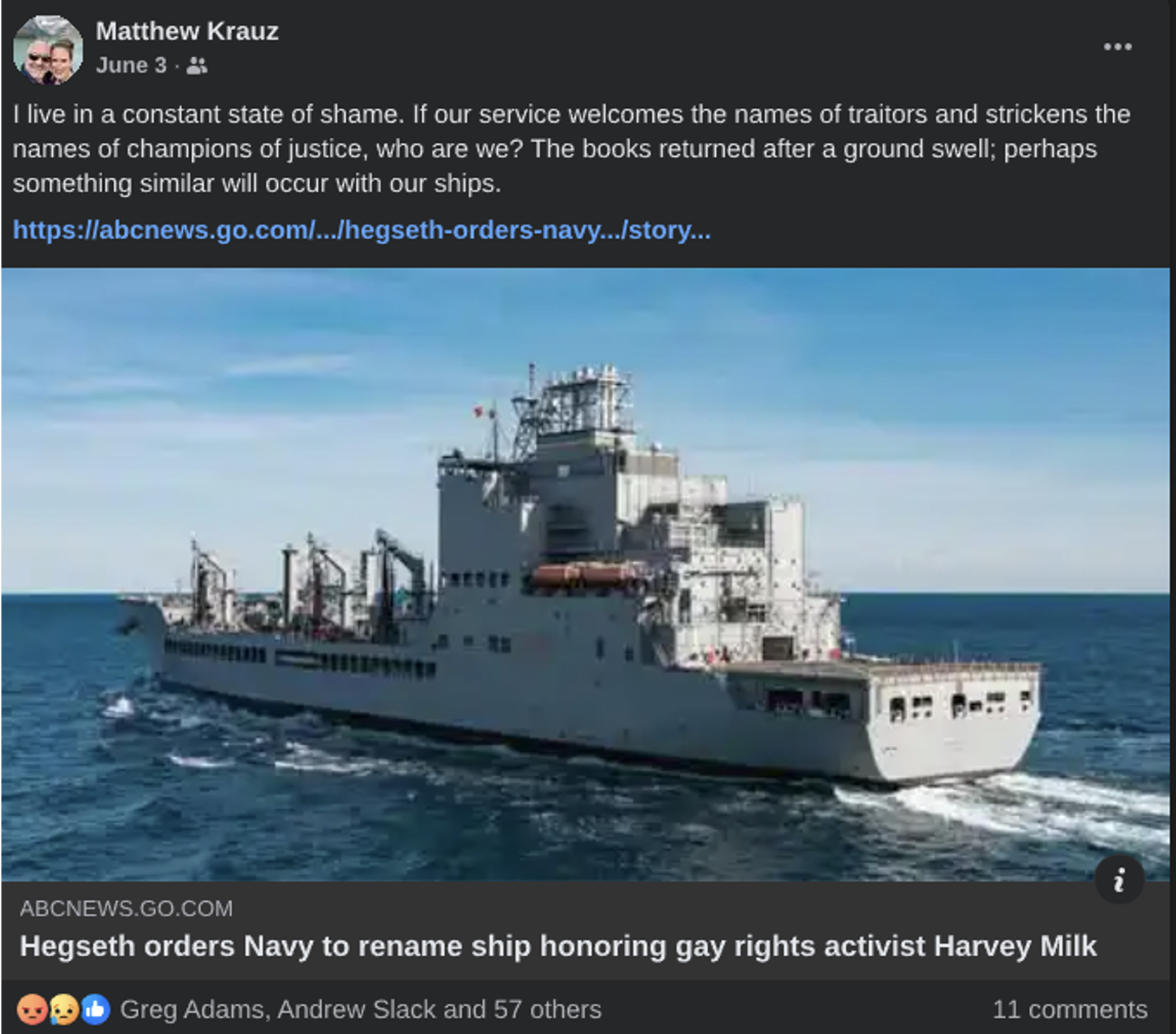 Krauz made multiple social media posts decrying the decisions of the Trump administration and decisions of Secretary Hegseth.