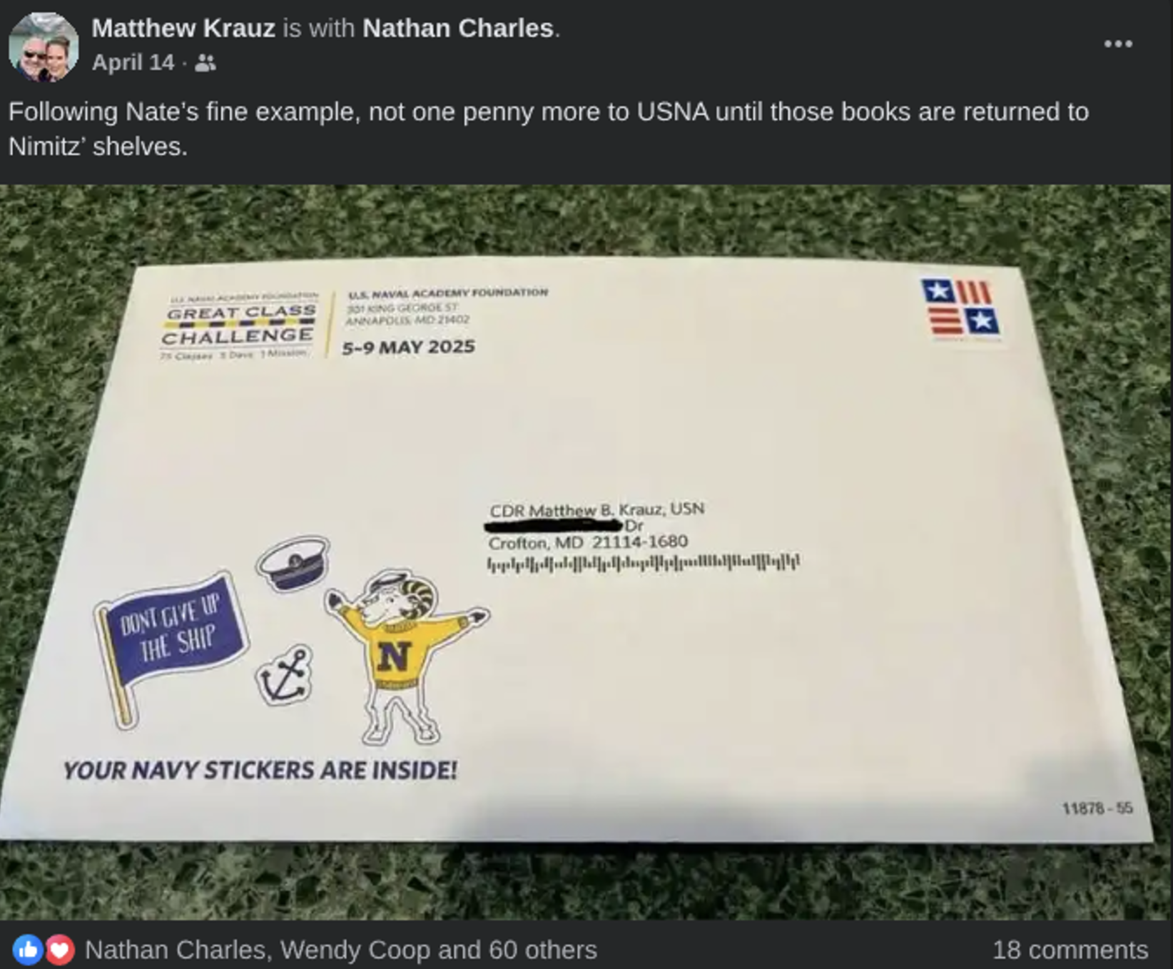 Krauz even called to stop funding to the Naval Academy Foundation.
