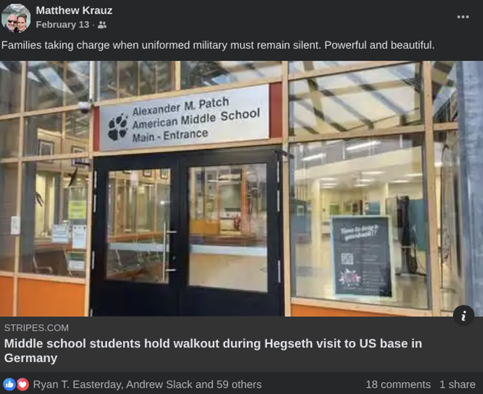 Krauz praised a walkout of students at an overseas military school protesting Sec. Hegseth.